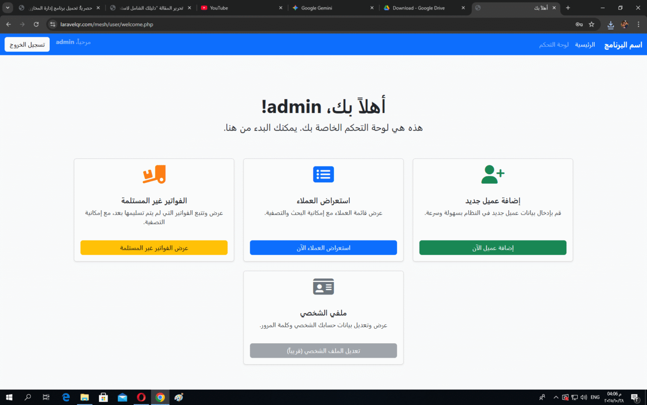 - نظام مستخدمين متكامل: يدعم صلاحيات مختلفة (مدير “Admin” ومستخدم عادي)، حيث يمكن للمستخدم العادي إضافة عملاء وفواتير فقط.